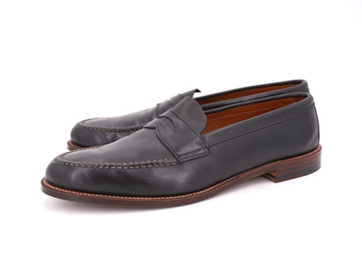 For your consideration a used pair of Alden half strap penny loafers. Leisure hand sewn uppers sewn by hand. Made from black chromexcel leather. Made on a single leather flex outsole, flat welt, antique edge trim, and