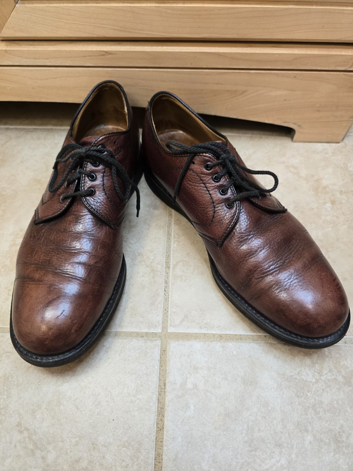 Shoes are preowned and upper leather shows some blemishes,scuffs and some dings.