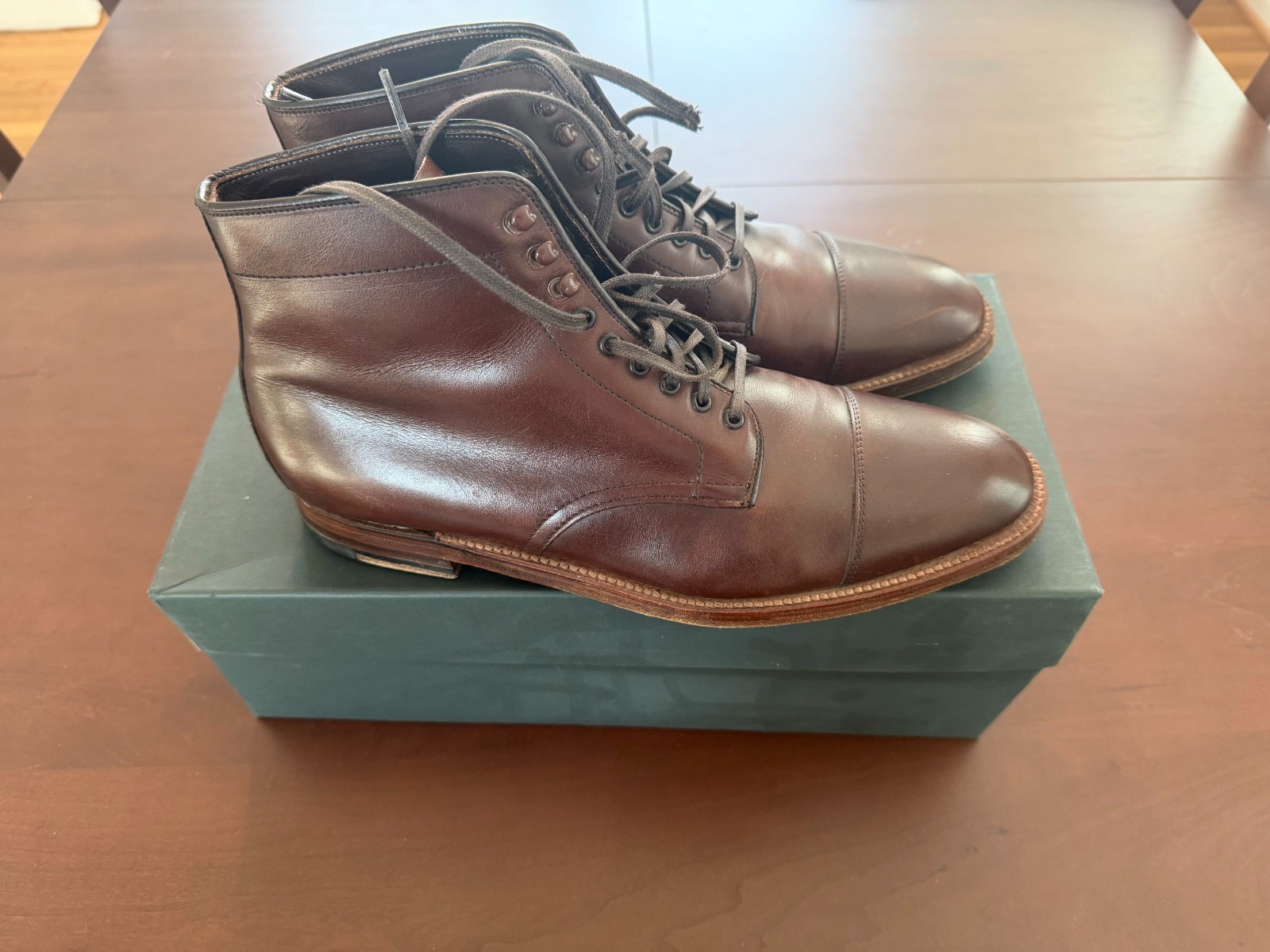 Selling my Alden Men's Straight Tip Boot Dark Brown Calfskin # 3912 in 9.5C. These were modified by a cobbler to have the speed laces at the top (the hooks). The boots were not polished before the photos to help illustrate their condition. I'm selling because I haven't worn them for a few season. Any questions please ask.