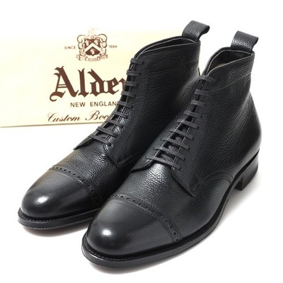 For sale is a pair of beautiful Alden cap-toe boots, created as a collaboration with Blackbird of Seattle. They show regular wear but are in excellent condition. A Vibram rubber half-sole was added to improve traction in all weather. The regina grain calf polishes nicely and is very comfortable. The description below is taken from the Blackbird site: ALDEN FOR BLACKBIRD: HAUFF'S DEPARTMENT STORE BOOTDesigned by Blackbird in collaboration with Alden of New England, makers of custom boots since 1884. The Hauff's Department Store Boot was inspired by early 20th century uptown gentleman's attire. You might have found a boot like this at Hauff's, Ballard's first department store, originally located on Ballard Ave. (1913 to 1918) and then on the ground floor of the Ballard Building on Market Street where Blackbird's corporate office now resides. AldenBlackbird 39621 Hauff's Department Store Bootin black STYLE: High top blucher boot with perforated straight tipLAST: Barrie (same as the Blackbird Short Wing Blucher)UPPER: Black Regina calfskin grain leatherOUTSOLE: extremely durable, water resistant double Waterloc outsoleINSOLE: vegetable tanned leather insoles with the "Made expressly for Blackbird" heel podMID-SOLE: cork mid-sole with steel shank for long-lasting strength and supportLACING: flat waxed lacing through no-show blind eyeletsWELT: black Goodyear leather welt constructionLINING: fully leather lined This pebble grain leather is capable of maintaining a high gloss, but left more to its own devices, it'll develop a broken-in patina faster than the harder shell leathers that Alden offers. Dress these up with a tailored heavy wool suit for fall or roll those jeans, throw on your car coat, and stomp out into the wet weather with confidence. Note: These shoes run large. We recommend sizing down half a size. If you don't see the size you're looking for, please contact us for assistance.