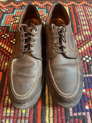 Pre owned Alden D3601 Tobacco Reverse Chamois Ranger Mocc in size 12 B/D. Made in USA, on the Van last (runs 1/4 size larger per Alden Model Project website), with a plantation crepe outsole. Some wear to soles, heels, and leather toe caps as shown in photos. General wear throughout and a cut in the leather on the right shoes as shown in photos. These were a special make for Need Supply, which aren’t available any more. I’m a size 12 AA/B, and these are too wide. Includes Alden box and shoe bags.