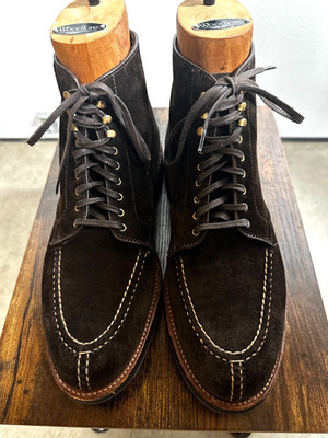Excellent, barely-worn shape. The suede is clean and plush with no bald spots, stains, or scuffs. As you can see from the photos, the soles have barely any wear. Always stored with Woodlore "The Boss" cedar boot trees, which I'll include with purchase.