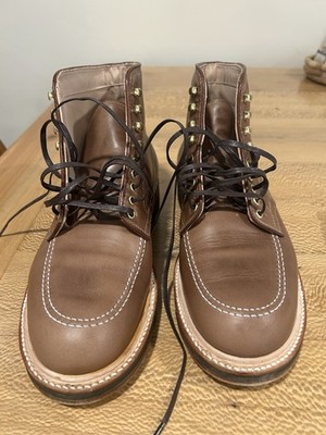 These are custom edition Alden x Snake Oil Provisions Indy Boots size 10 in Horween's Natural Chromexcel. One week old. Retail for $566.00 USD before taxes/shipping These boots have been worn three times and are in excellent condition. As close to new as possible. Slight creasing forming on the toe box which is typical of indy boots in the first few wears. The 9.5's were sold out so I opted for this size 10 (last one) now sold out as well. Unfortunately, they are ever so slightly too big. I'm a true size 10.5 on a brannock device and I believe since my feet are slightly narrow that these just don't fit like my 9.5D indy boots (405's) in calf skin do. So, I'm taking the hit for my haste. Bummed. The boot are truly beautiful in person and the make-up is very cool and unique. Super comfortable as well...as Alden is know for. Free shipping within the contiguous US. Sorry no international shipping. Any questions, please let me know. Best, Paul